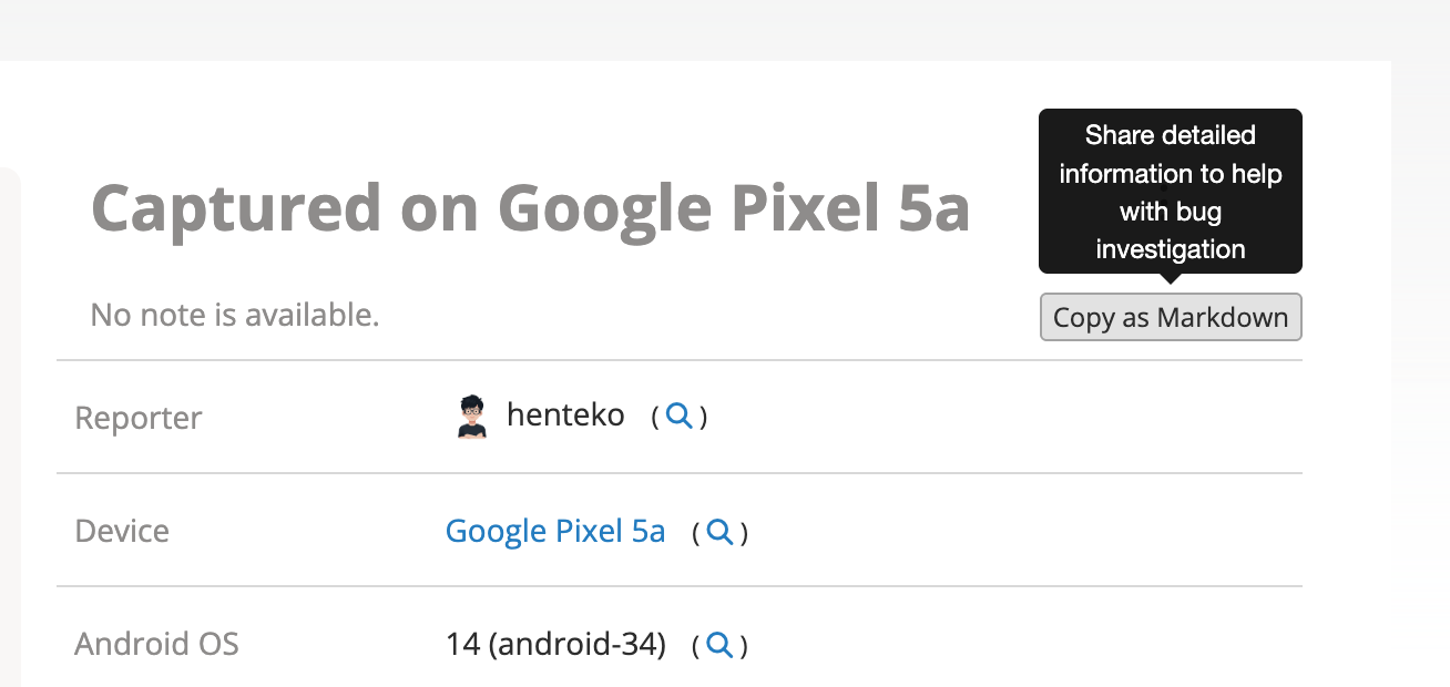 We have released a feature that allows you to copy capture data, including device information, in Markdown format from the Capture Details page. You can now easily paste the information directly into Jira, GitHub Issues, and other platforms when reporting bugs.